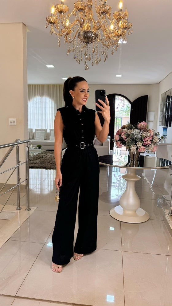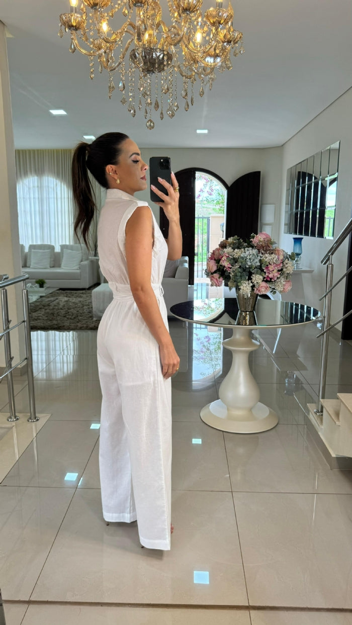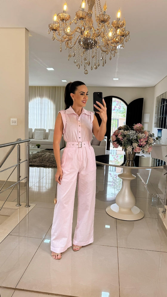 O Macacão Zita é a combinação perfeita de charme e elegância. Com fechamento em botões frontais e gola clássica, ele oferece um design sofisticado. Confeccionado em tecido de linho, sua modelagem pantalona garante leveza e conforto. Acompanha um cinto, valorizando ainda mais a silhueta e o estilo.
