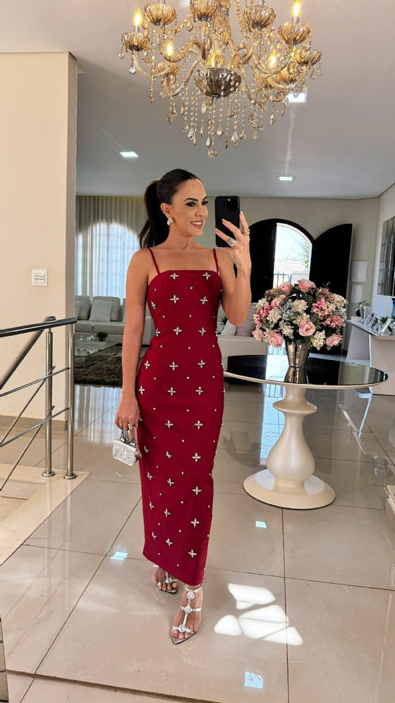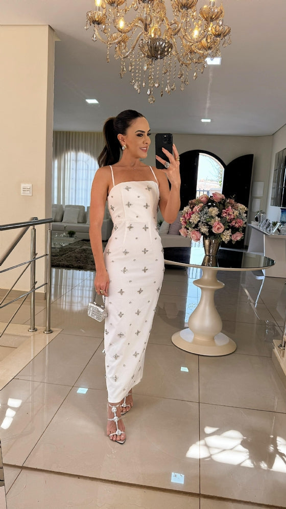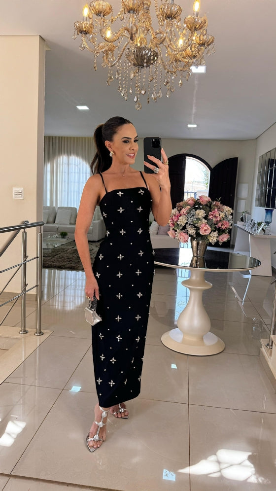 O Vestido Taylor é puro charme e sofisticação. Confeccionado em tecido de alfaiataria, ele apresenta elegantes detalhes de brilho bordado na parte da frente, tornando-o único e glamouroso. Com fechamento em zíper nas costas, alcinhas reguláveis, e uma discreta fenda na parte de trás, é um vestido perfeito para arrasar em ocasiões especiais.
